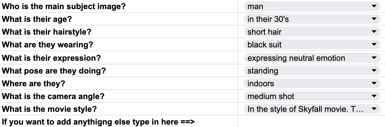 This prompt builder has been created with the Action Movie Genre in mind. So the drop down menus include items to create Action Movie characters…