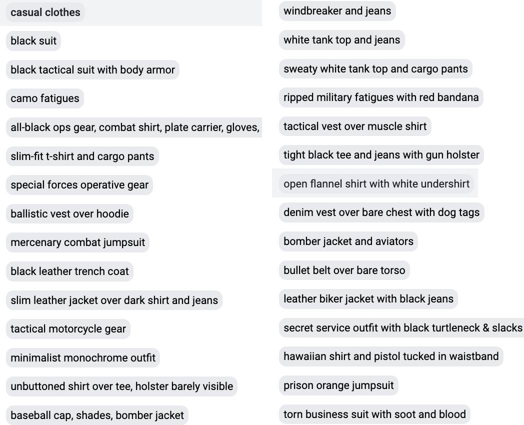Make your characters wear all kinds of action movie themed outfits like: