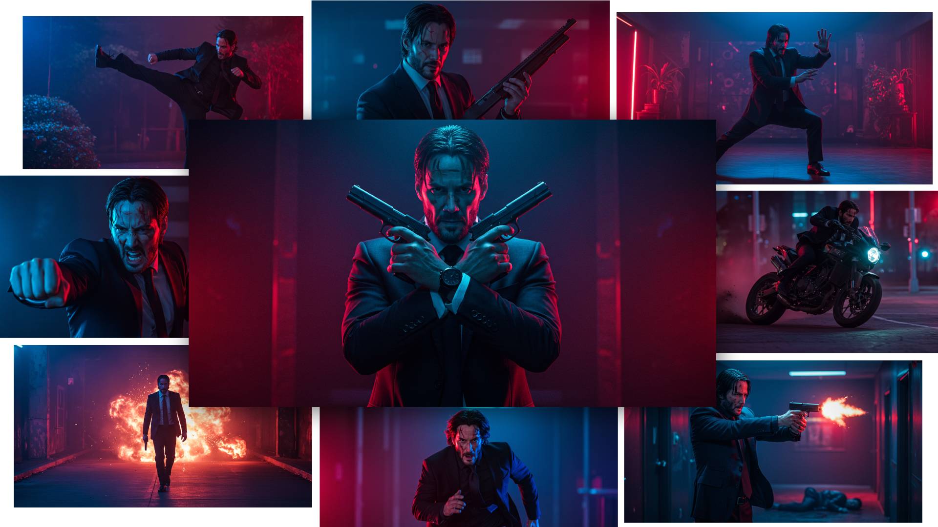 In the examples below you can see John Wick doing all kinds of different action poses. Punching, kicking, holding a gun, driving a motorcycle, running, walking away from an explosion, and more. You can put any character into any pose.