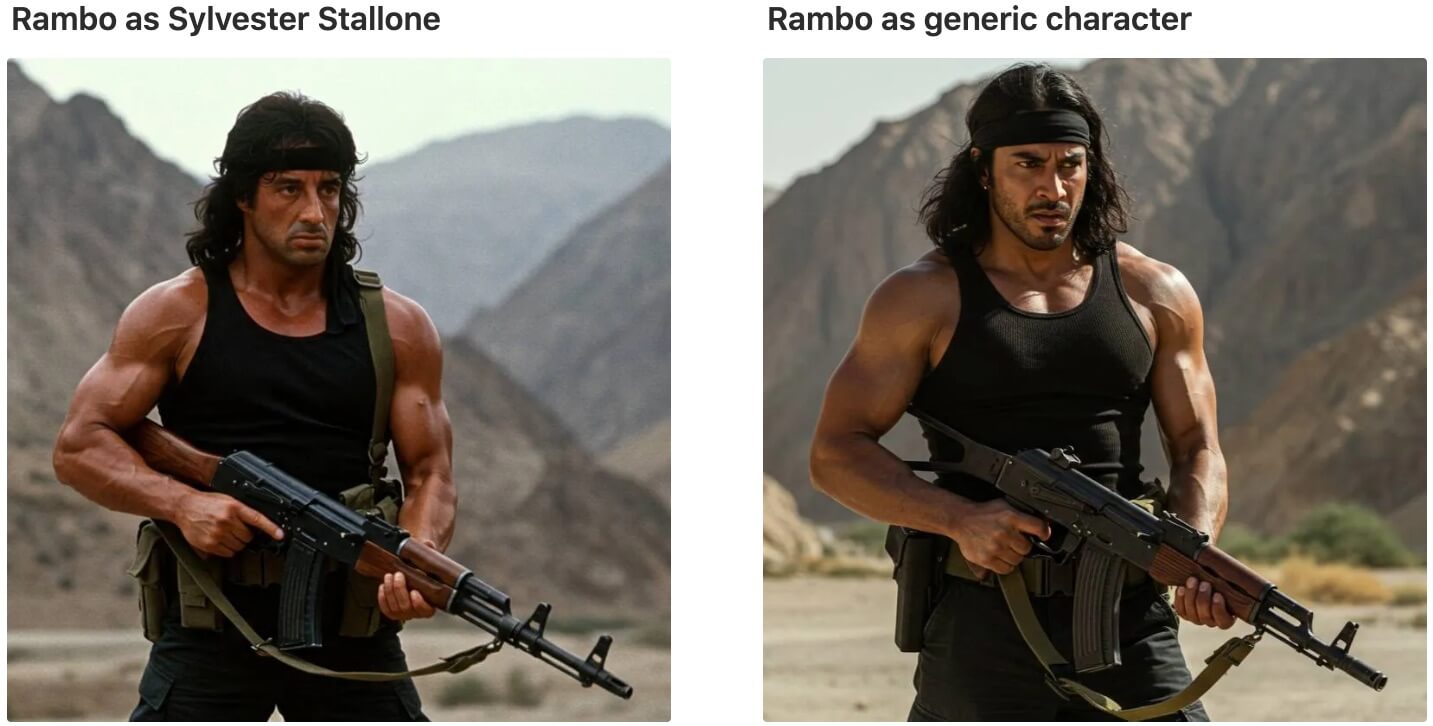 For example, you can create an image of John Rambo just as he appears in the movie and played by Sylvester Stallone. Or you can create the likeness of the Rambo character, with the exact same clothes and features, but make him look like some general human.