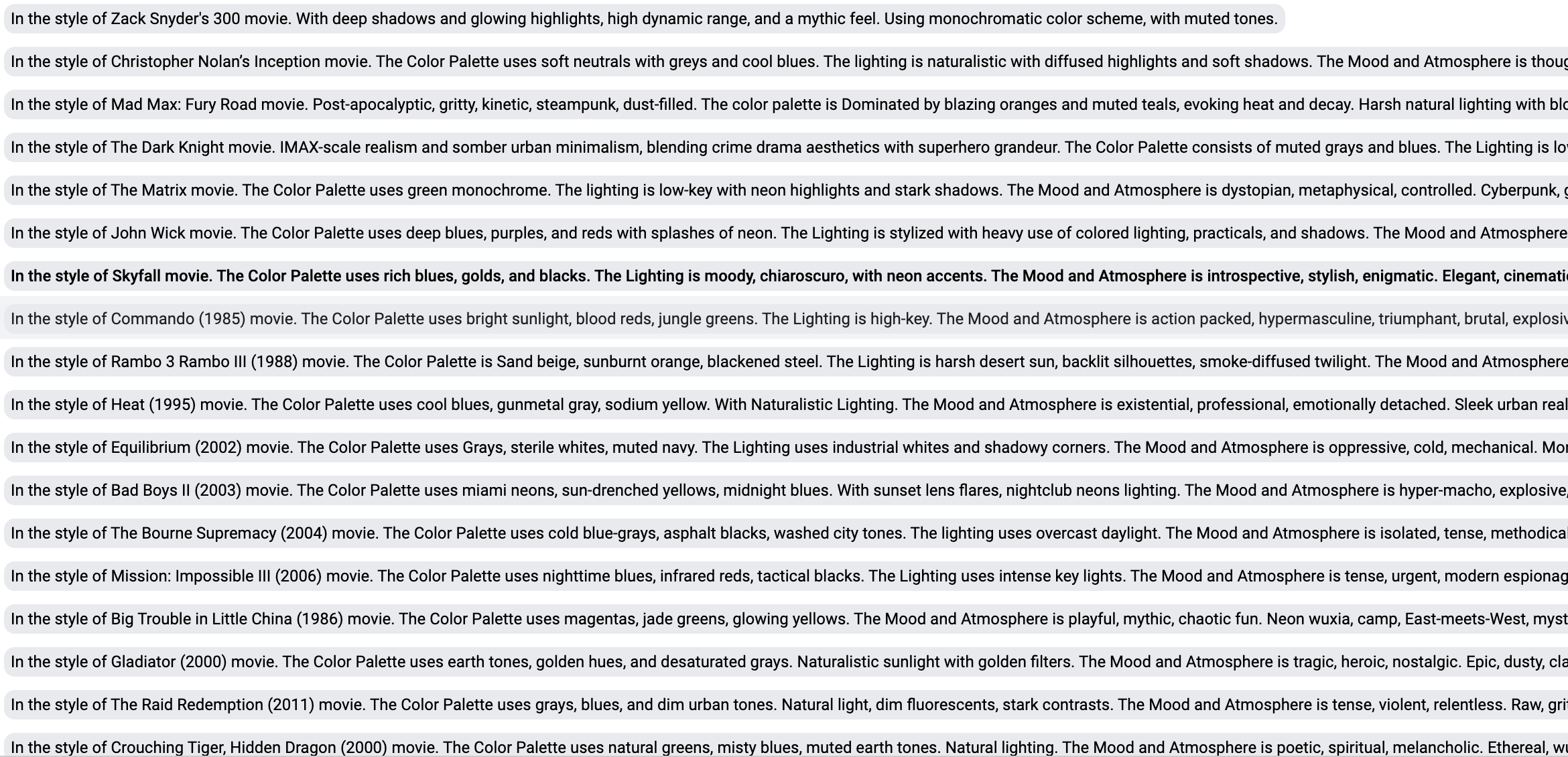 These are highly-detailed and descriptive prompts that capture the movie’s color palette, lighting, mod and atmosphere, and more.