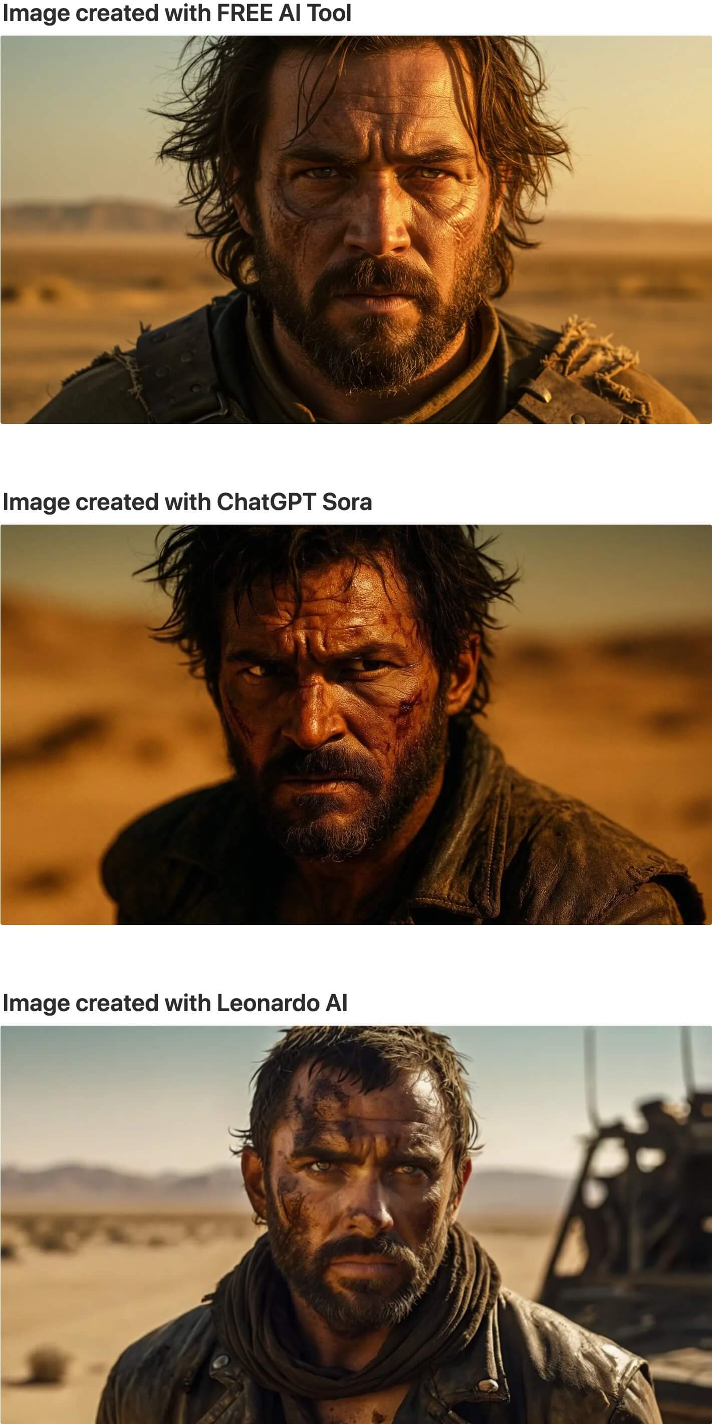 “Cinematic close-up movie still in Mad Max: Fury Road style of a weathered man with wild dark hair and beard wearing a torn leather jacket, harsh golden desert sunlight creating dramatic shadows across his scarred face, sun-bleached brown and orange color palette with deep amber highlights, shot with 85mm lens creating shallow depth of field with desert wasteland blurred in background, intense survival portrait cinematography”