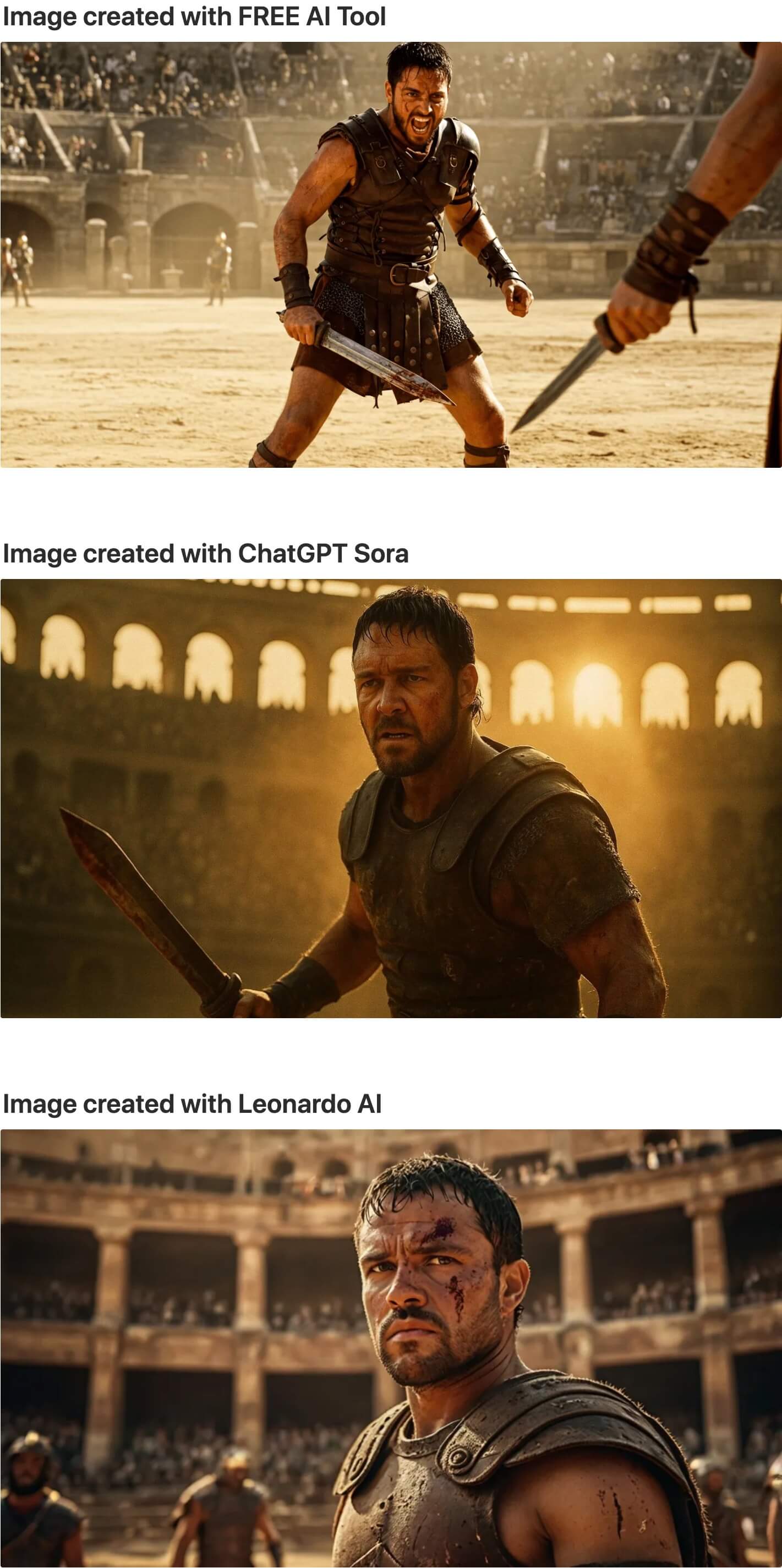 “Battle-scarred Maximus in worn leather and chainmail armor standing in Colosseum arena sand, shoulder-length dark hair matted with sweat and dust, fierce determined expression with clenched jaw, gripping bloodied gladius sword while facing unseen opponent, golden afternoon sunlight streaming through arena archways creating dramatic rim lighting, 80,000 spectators blurred in background stands, low-angle heroic shot emphasizing warrior stature, warm golden color palette with deep shadows, epic historical cinematography with film grain texture.”