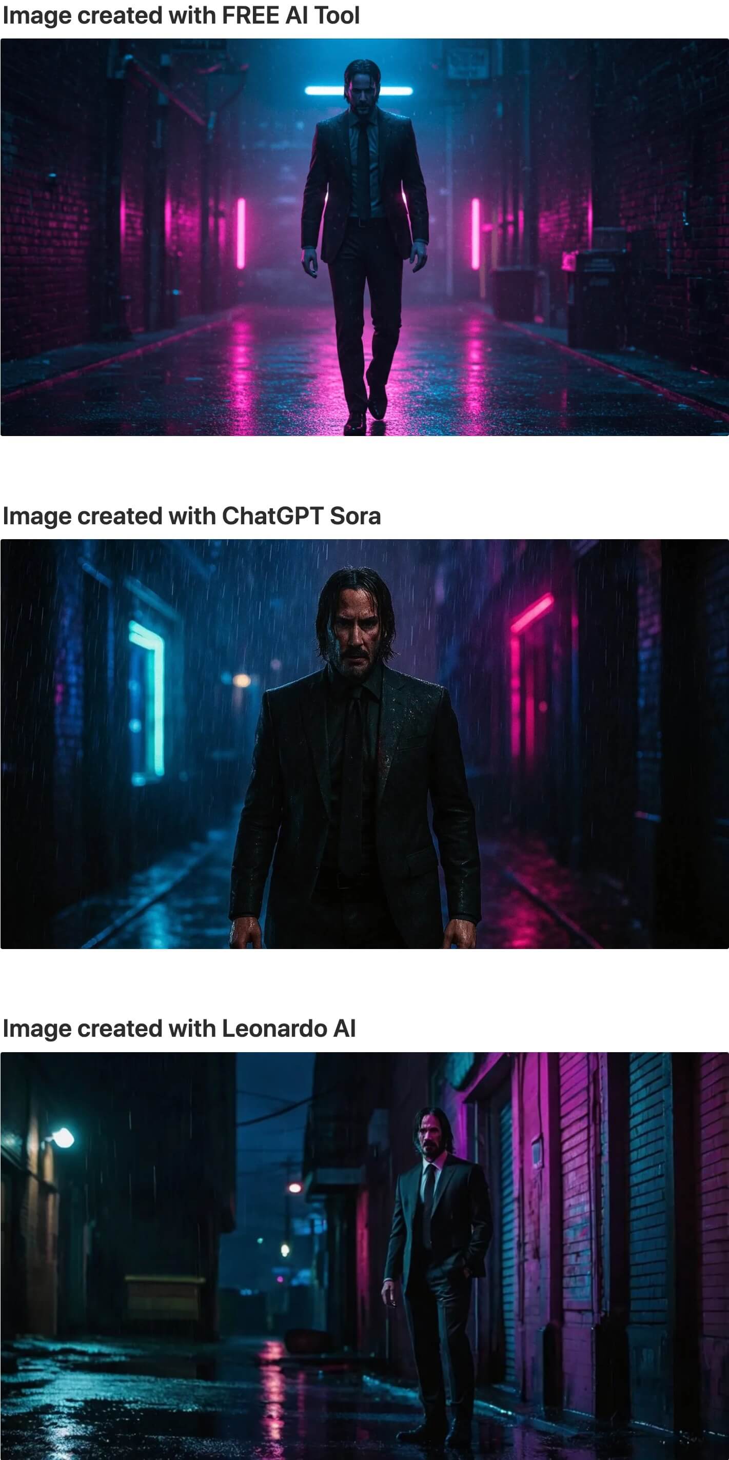 "Cinematic movie still image in the style of John Wick. Man in a sleek black suit, rain-soaked, standing in a alleyway, hands casually by the side. Deep shadows contrast with electric blue and magenta neon reflections on wet asphalt. Moody atmospheric lighting with heavy contrast, film noir aesthetic, hyperrealistic detail, gritty urban environment, cinematic depth of field."