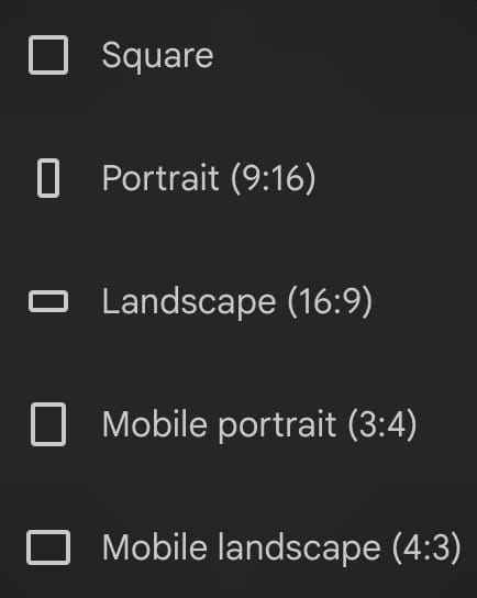 Create images for any platform. Choose from square, portrait or landscape aspect ratios (1:11, 9:16, 16:9, 3:4, 4:3)