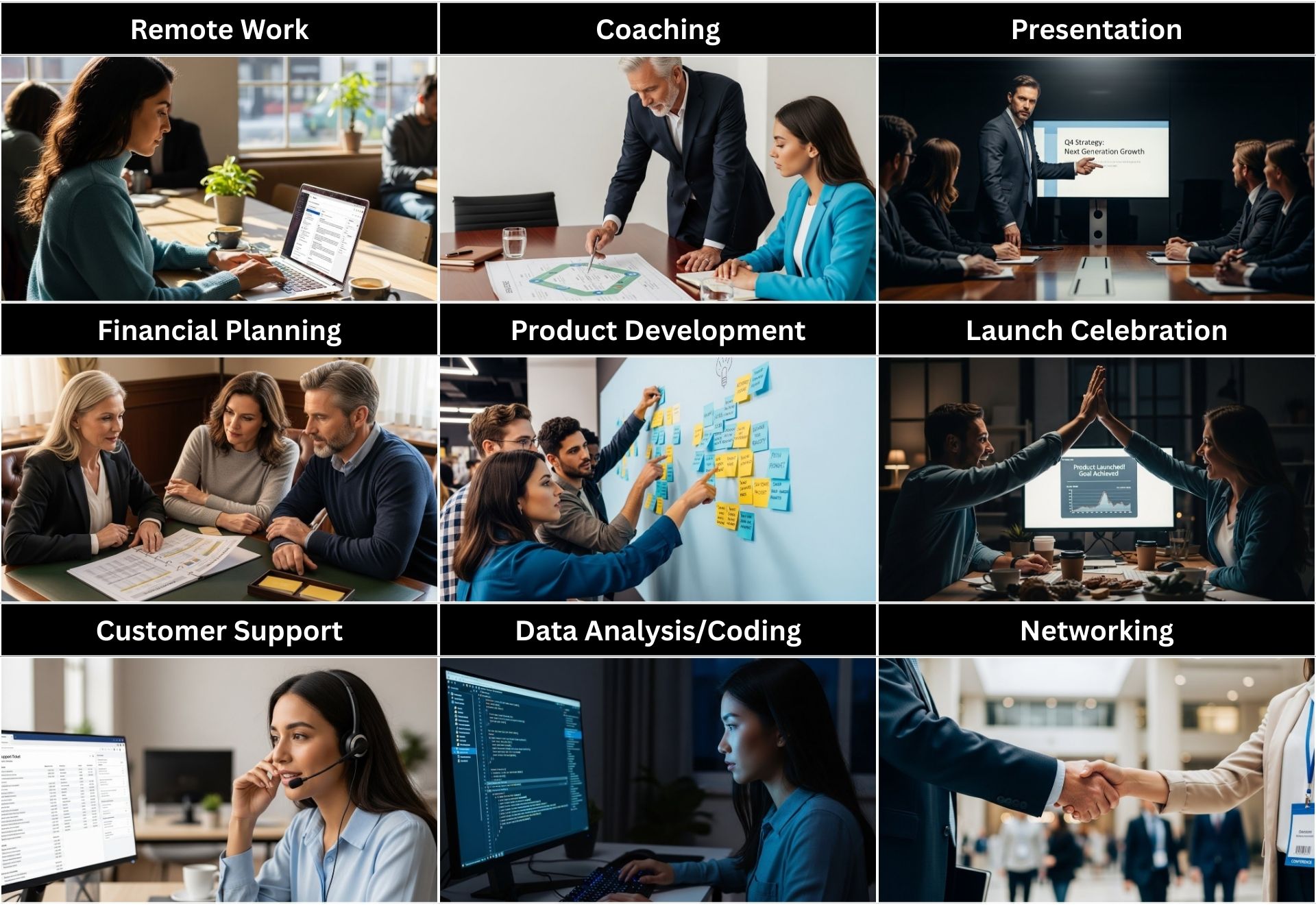 The prompts are divided into 20 business categories including: Remote Work, Coaching, Presentation, Financial Planning, Product Development, and more. Each category comes with ready-to-go prompts featuring business people in all kinds of unique scenes and situations.
