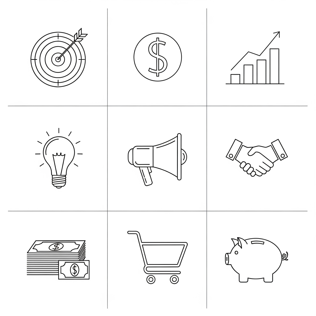 Create clean and modern business icons in sets of 9. All the icons have the same visual style, so they look like they all belong together. And you can replace the icon shapes with what ever you want. For example instead of a Dollar sign you can include a Briefcase, or a Wallet, etc..