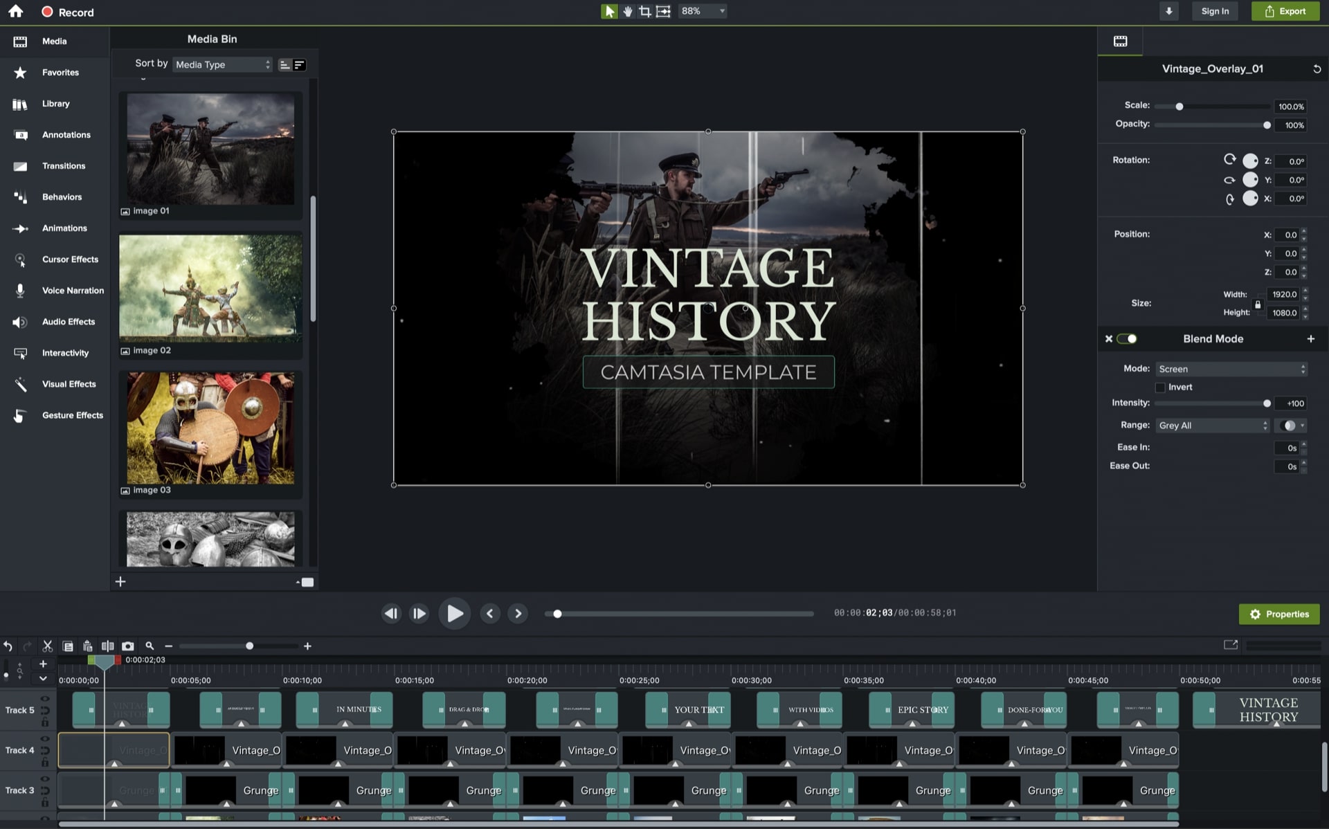 The template creates cinematic “vintage” style videos. It has a dramatic and epic feel and is great for creating history videos, trailers, fitness videos, extreme sports, etc..