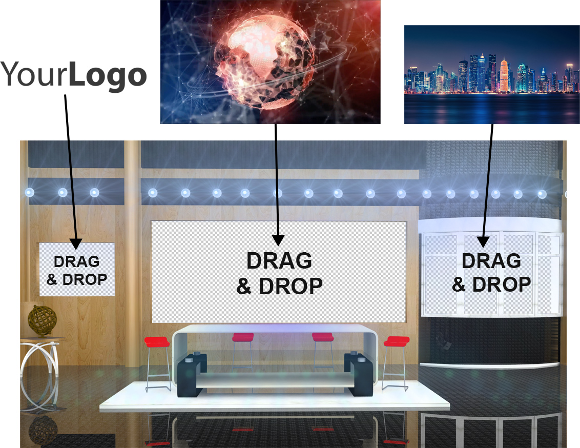Most background packs out there come with none-editable MP4 videos or JPG images. Virtual Studio Builder allows you to edit the backgrounds with your own logo, city backdrop image in the window, and your own video or image inside a monitor screen.