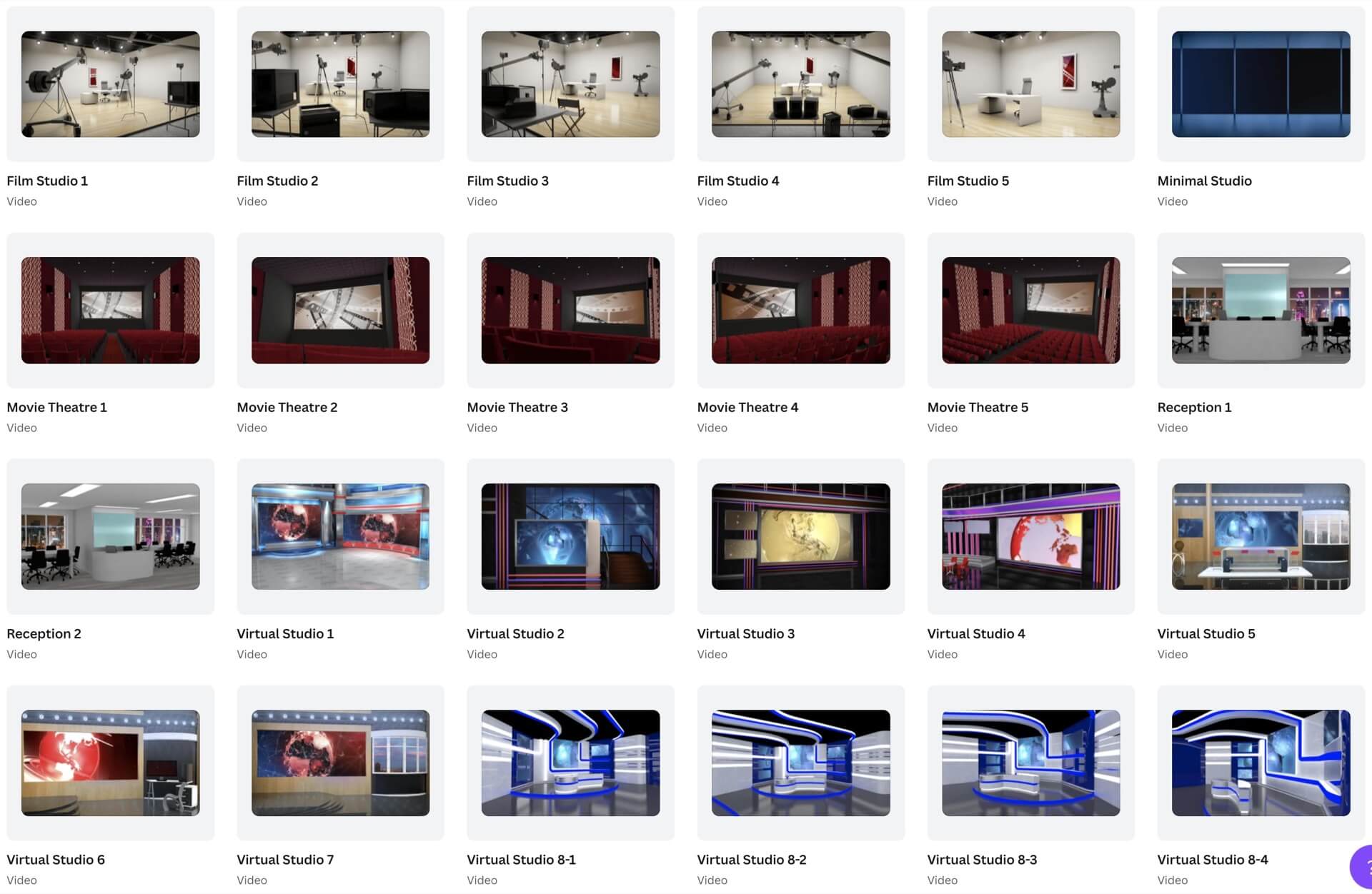 These virtual studio backgrounds come in different styles like: Newsroom, film studio, classroom, movie theatre, reception, and more.