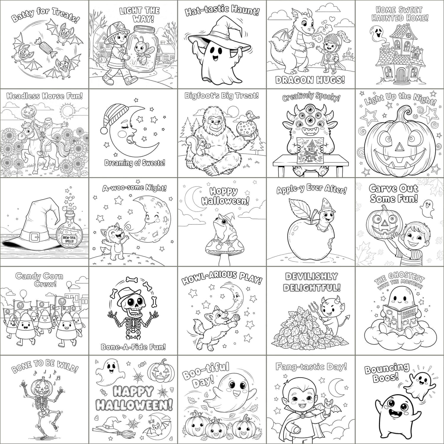 Each coloring page comes with a Halloween themed illustration and catchy play on words phrase like: