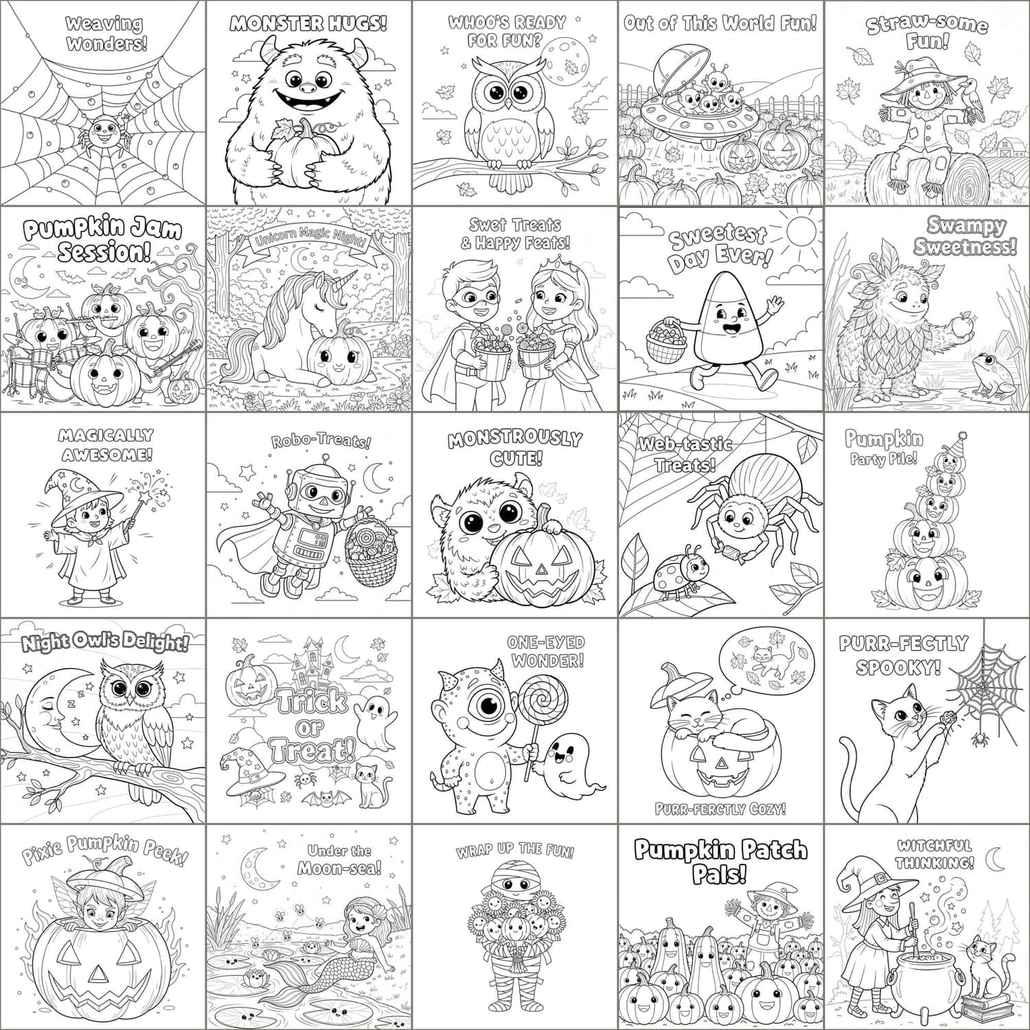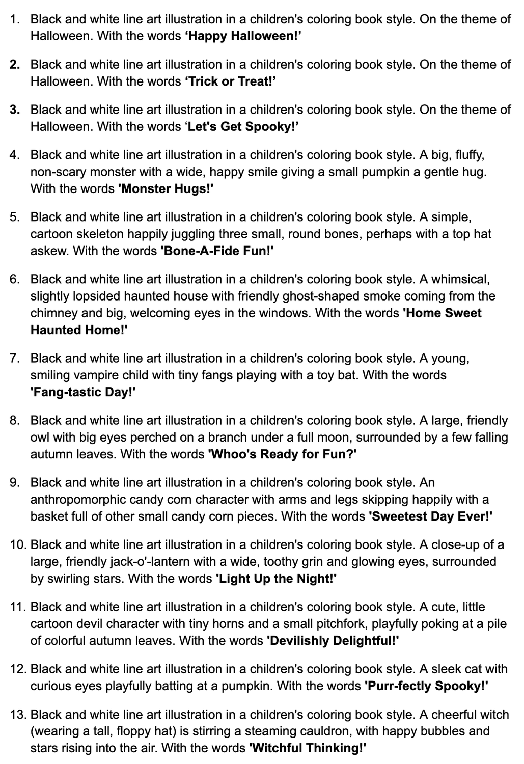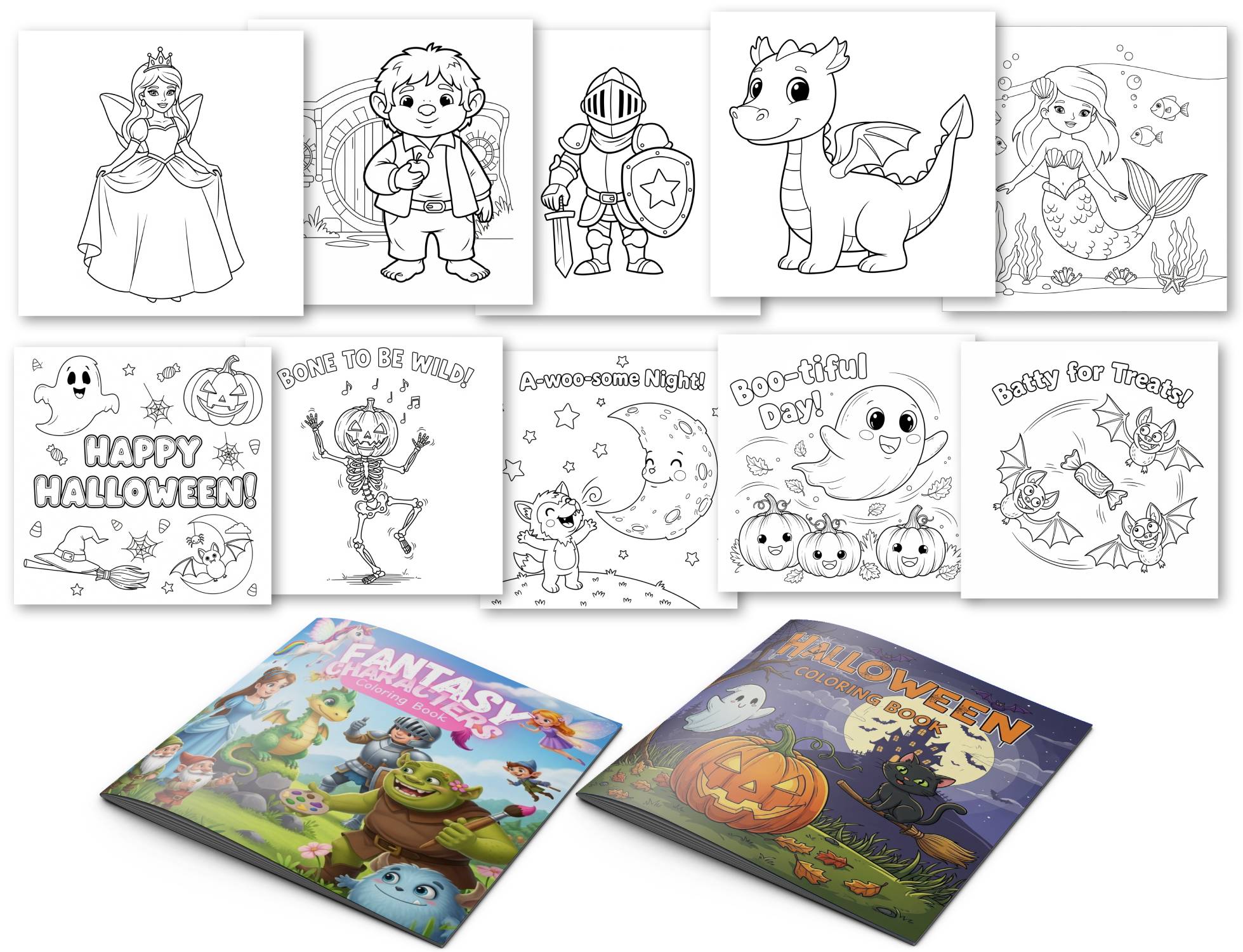 Create your own coloring pages just like the ones in this toolkit. Just copy and paste the done-for-you prompts into your favorite AI image tool. You'll get prompts for 100 unique Halloween themed coloring page scenes with catchy phrases and Fantasy / Halloween characters.