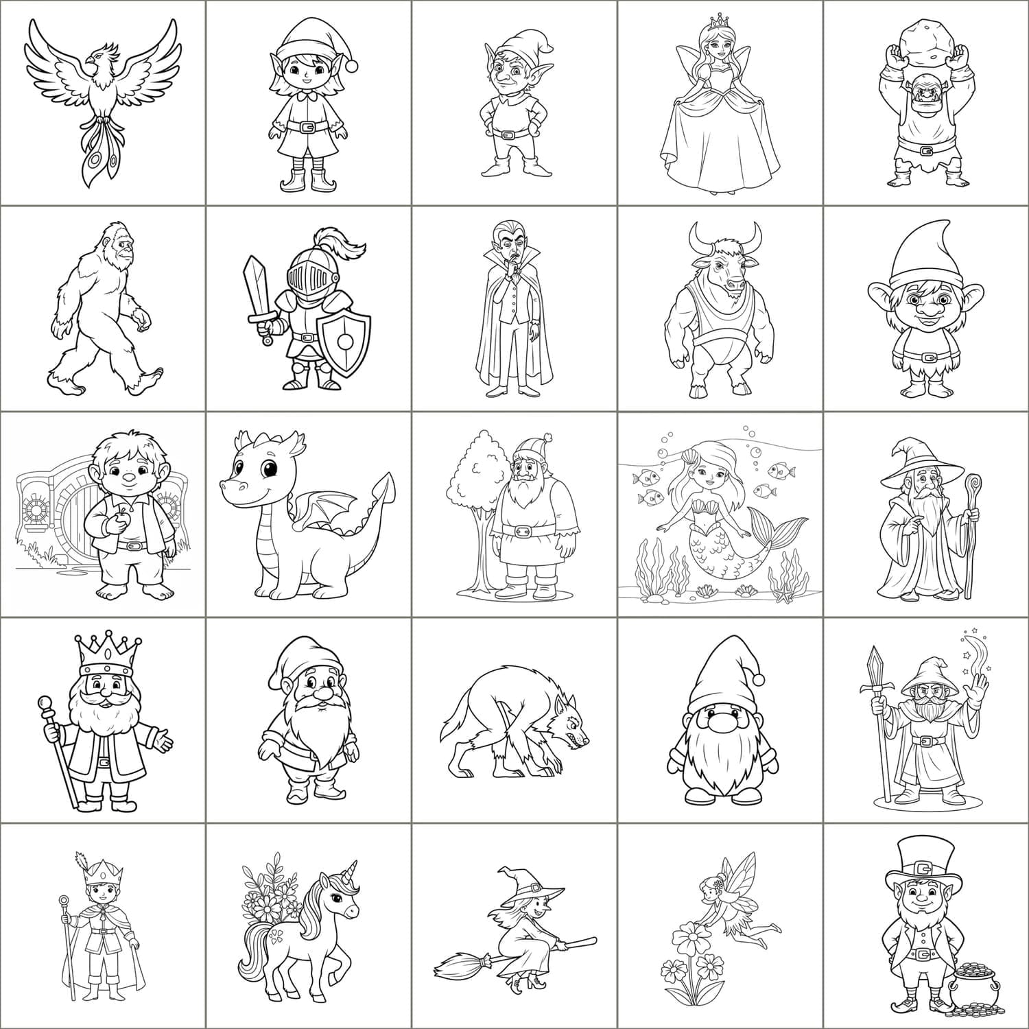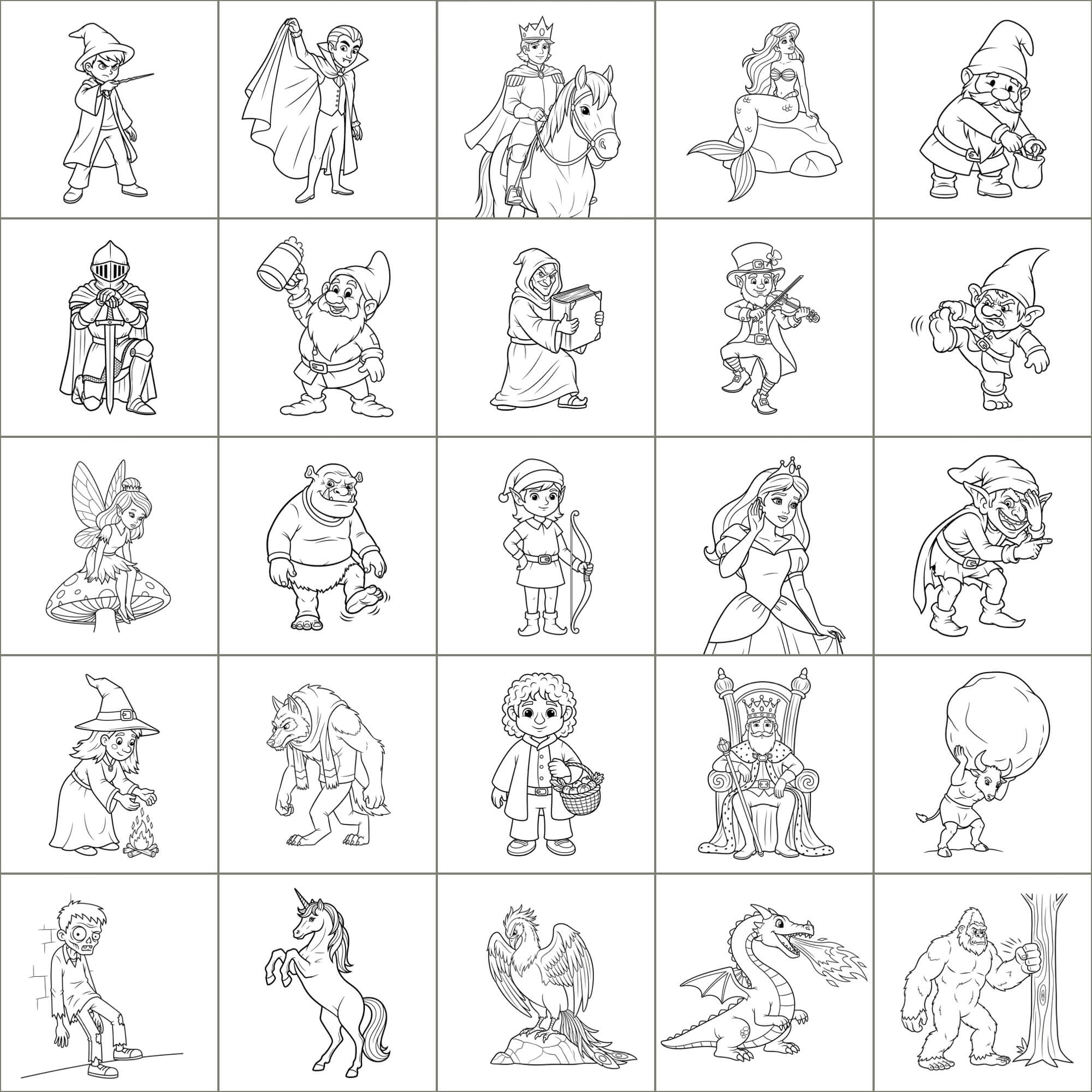 This pack features popular fantasy characters like: Princess, King, Knight, Dragon, Unicorn, Mummy, Mermaid, Wizard, Ogre, Gnome, Leprechaun, Fairy, and more. There are 25 different Fantasy Characters and each character comes in 15-25 different coloring page variations, for a total of 500+ coloring pages.