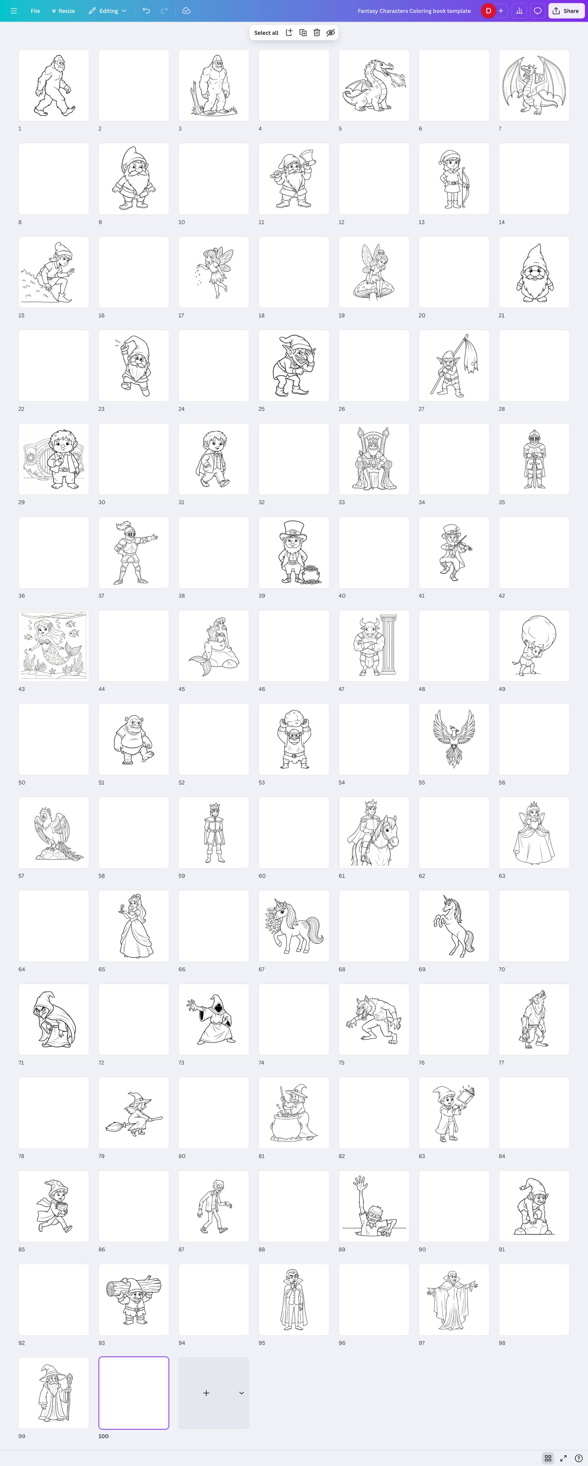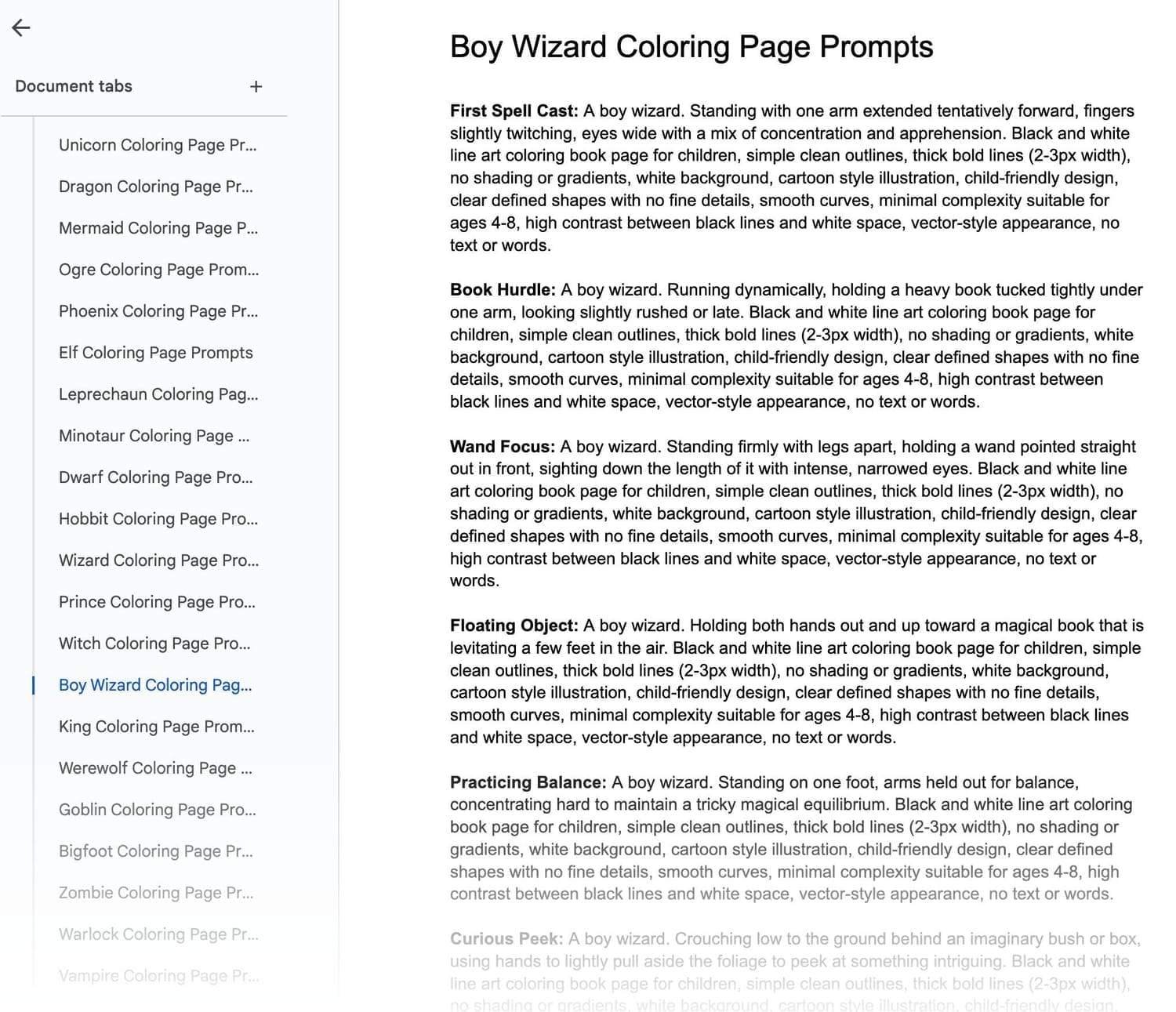 Create your own coloring pages just like the ones in this toolkit. Just copy and paste the done-for-you prompts into your favorite AI image tool. You'll get 250 prompts for 25 different fantasy characters with 10 prompts each. Each prompt creates a fantasy character in a different pose and situation.