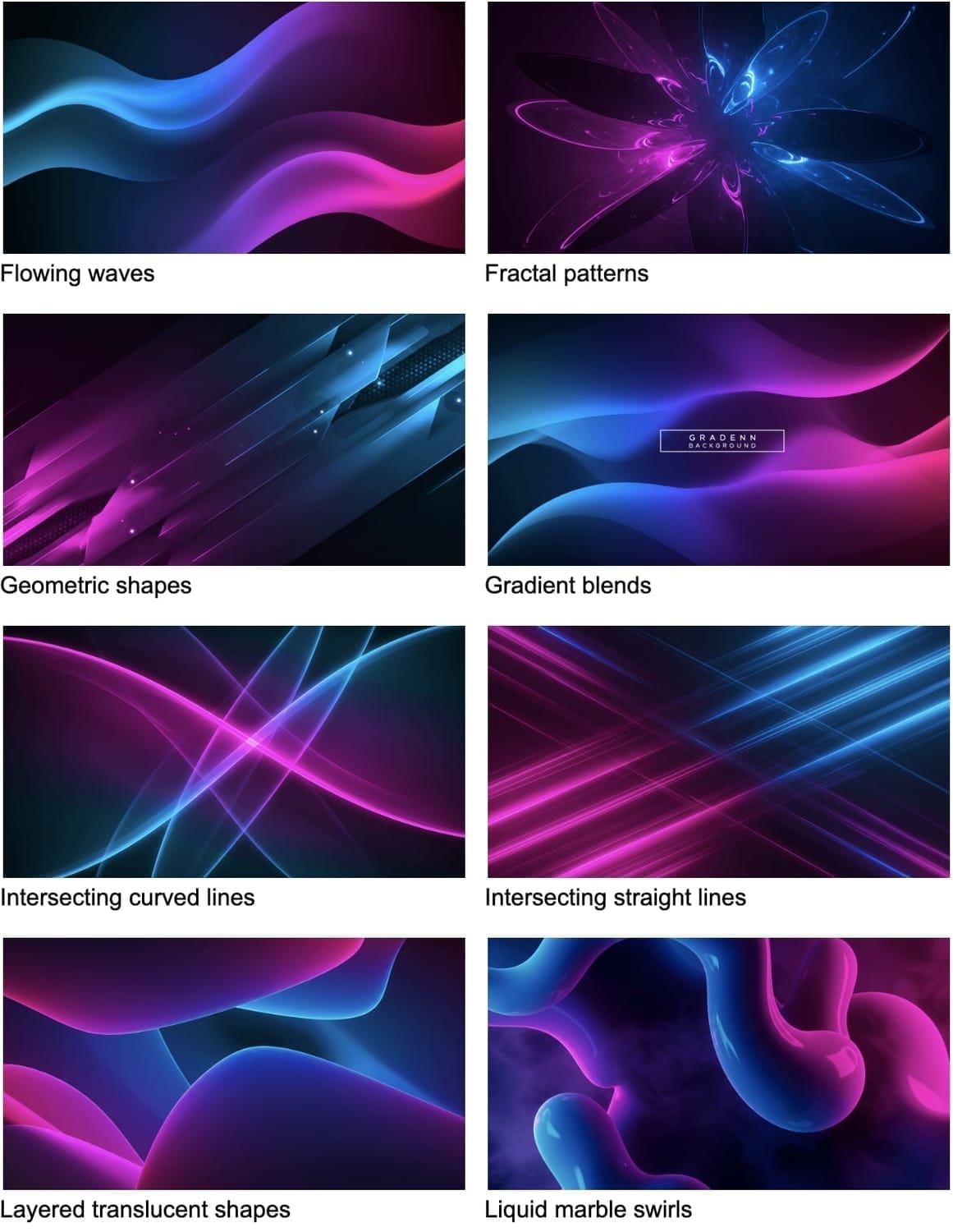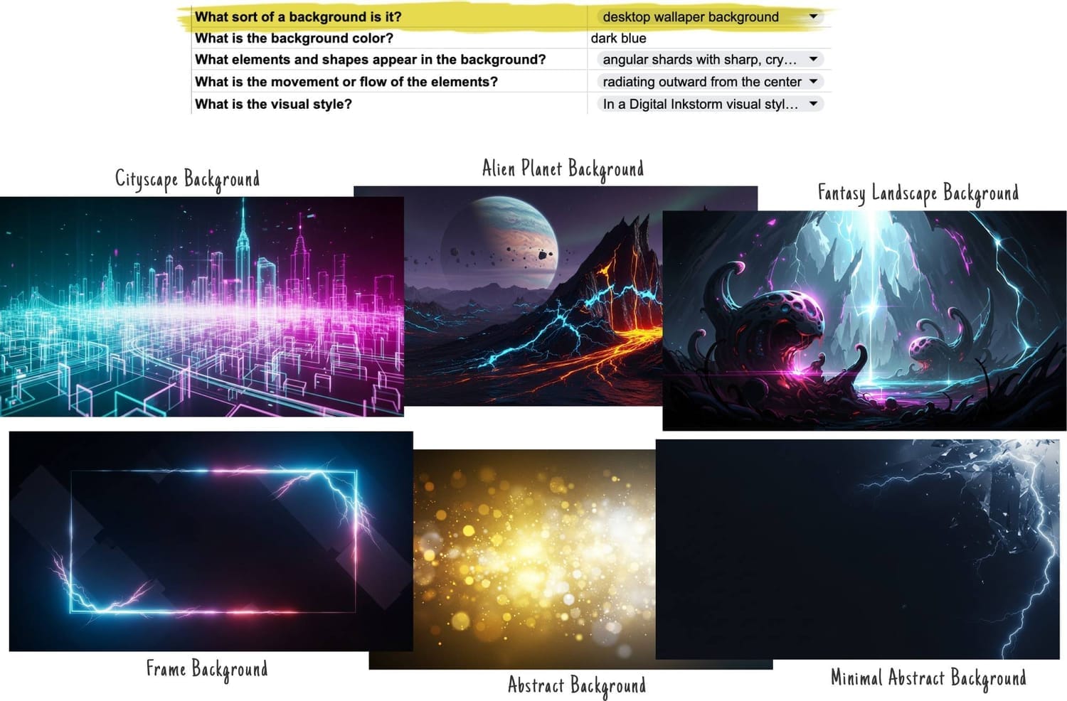 With this Prompt Builder there is a HUGE variety of backgrounds you can create. For example, you can take 1 Visual Style like: "Neon Dreamscape". Then apply different Shapes and Elements to this visual style and get different looking results like the ones below...