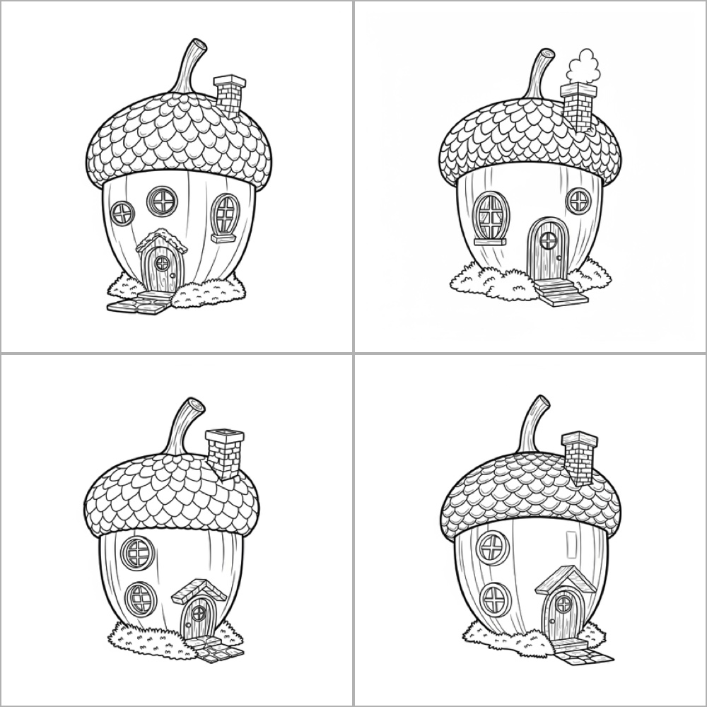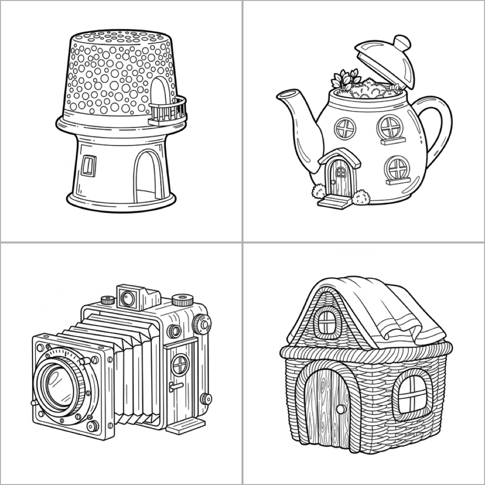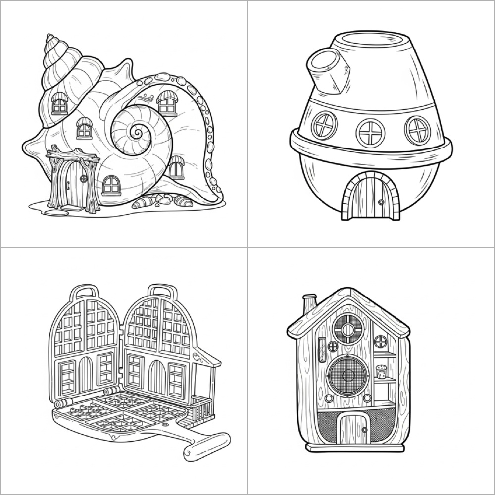 The coloring pages in this pack feature real life objects turned into tiny homes like houses, castles, cottages, etc..