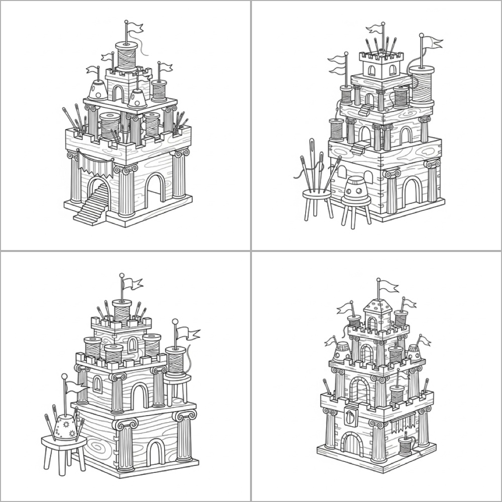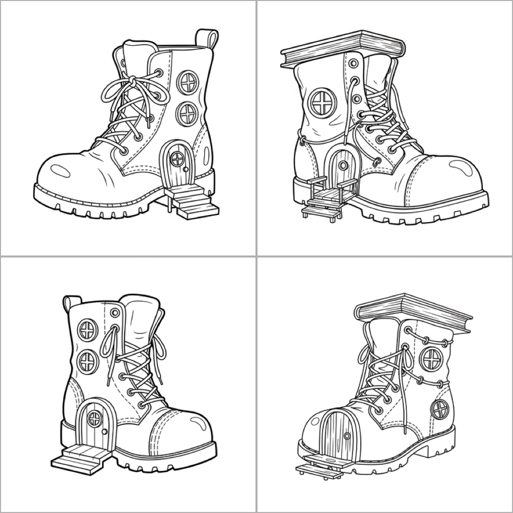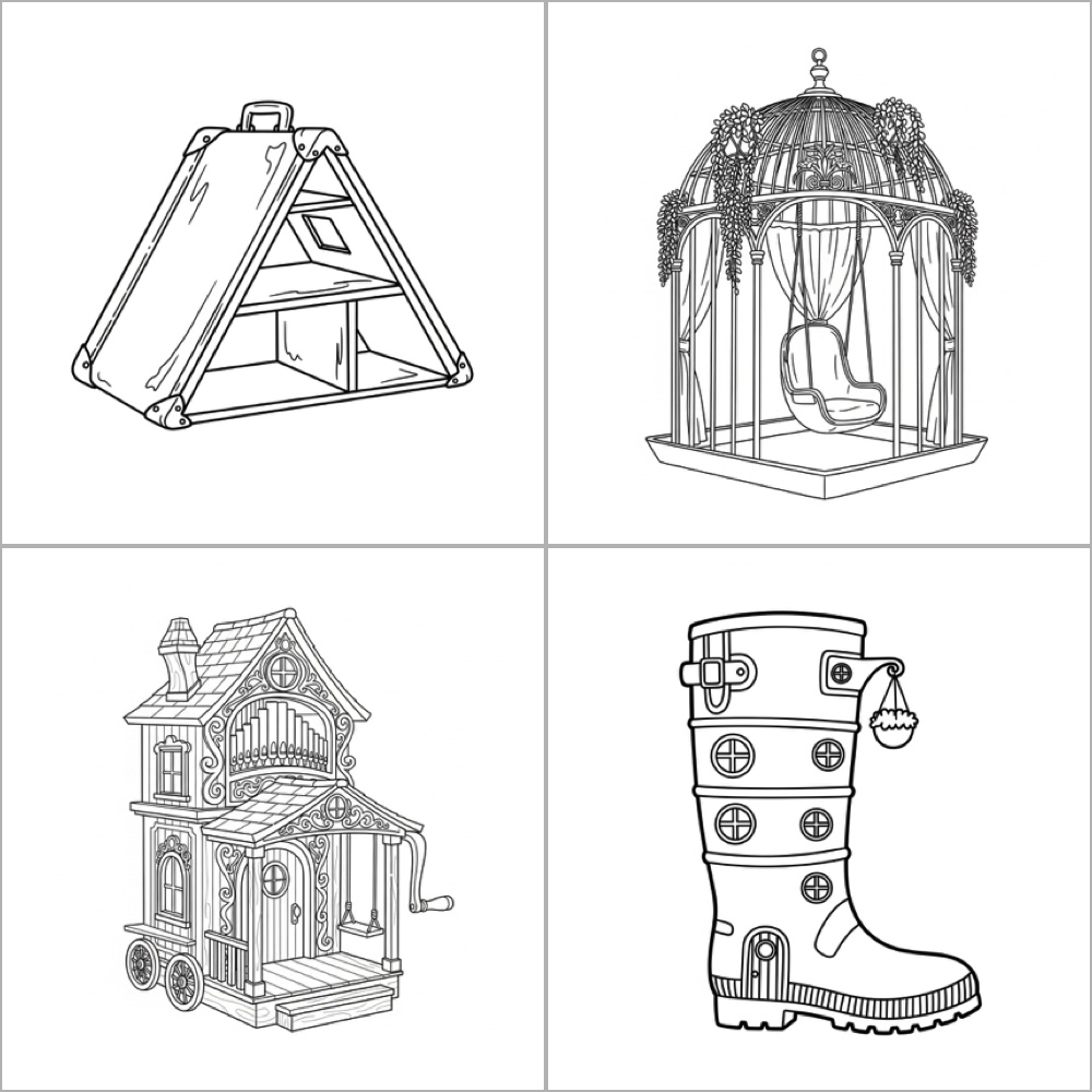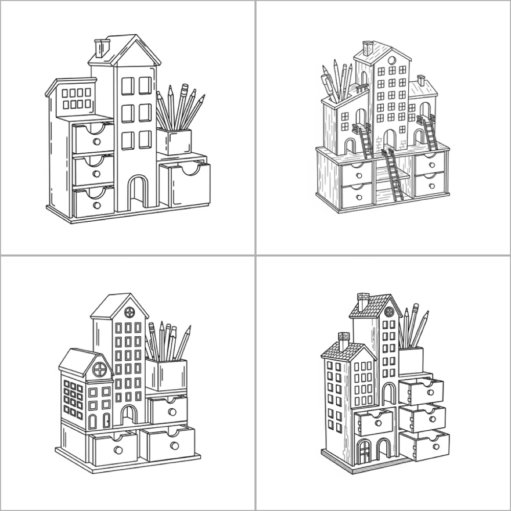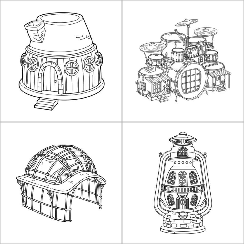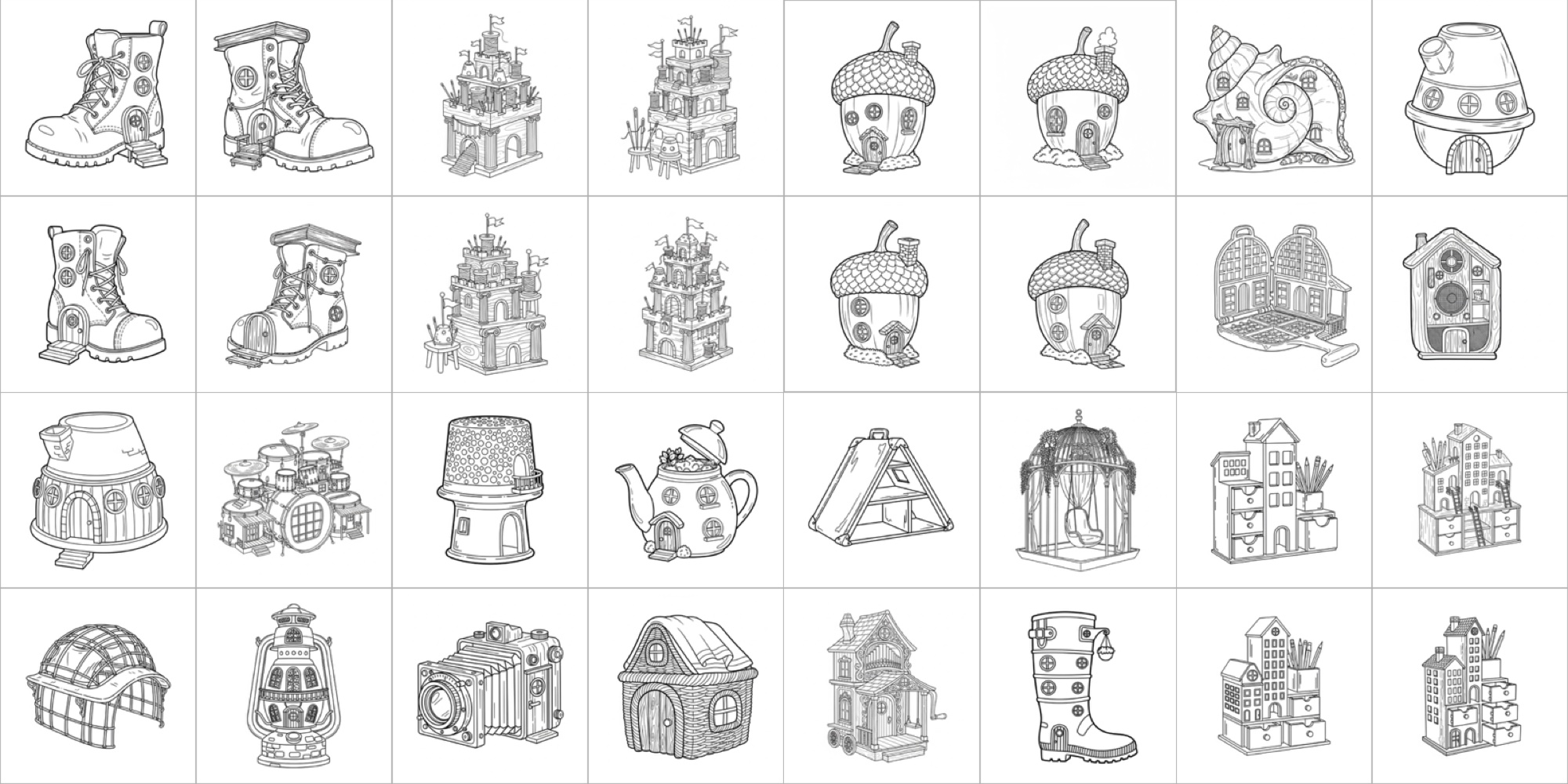 This pack features 25 "tiny homes" including: Acorn Tiny Home, Bicycle Basket Hideout, Birdcage Conservatory, Desk Organizer Complex, Drum Kit Castle, and many more. Each "tiny home" comes in 10 - 15 different coloring page variations, for a total of over 300 coloring pages.